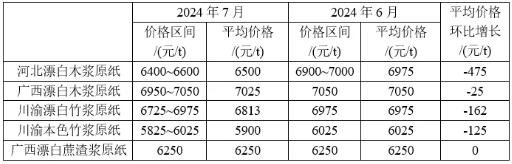 2024年7月,除廣西漂白蔗渣漿原紙價格保持不變外,其他各類原紙平均價格均有下降,其中河北漂白木漿原紙平均價格降幅最大,下降475元/t。