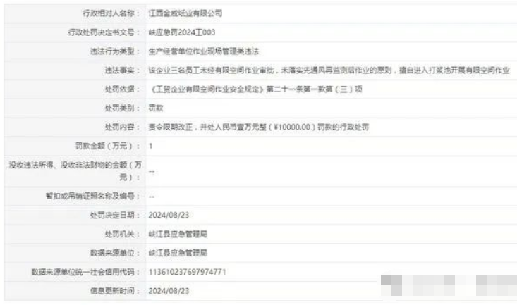近日,江西金威紙業有限公司因該企業三名員工未經有限空間作業審批,未落實先通風再監測后作業的原則,擅自進入打漿池開展有限空間作業,被峽江縣應急管理局責令限期改正,并處人民幣1萬元整(¥10000)罰款的行政處罰。 據公告內容,該企業三名員工未經有限空間作業審批,未落實先通風再監測后作業的原則,擅自進入打漿池開展有限空間作業。 江西金威紙業有限公司違反了《工貿企業有限空間作業安全規定》第二十一條第一款第(三)項,構成了生產經營單位作業現場管理類違法違規行為。被責令限期改正,并處人民幣1萬元整(¥10000)罰款的行政處罰。
