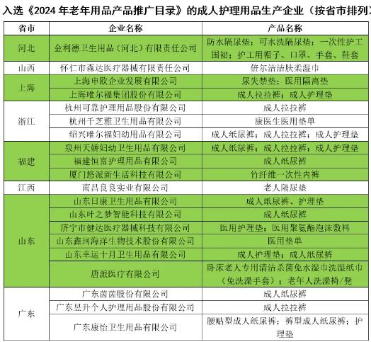 2024年9月25日,工業和信息化部正式公布了《2024年老年用品產品推廣目錄》。杭州可靠、杭州千芝雅、廣東康怡、泉州天嬌、上海唯爾福、金利德、上海申歐、福建恒富、山東日康、山東葉之夢、廣東茵茵、廣東昱升等20家成人紙尿褲、護理墊、濕巾和一次性內褲生產企業成功入選,為優質成人護理用品樹立了典范。 促進老年用品產業發展是新時代積極應對人口老齡化的重要舉措,是滿足人民美好生活需要的必然要求。國家對老年用品產業高度關注,工信部于2022年、2023年、2024年連續發布了《老年用品產品推廣目錄》,旨在讓更多消費者了解并使用到這些優質產品,從而提升老年人生活質量。
