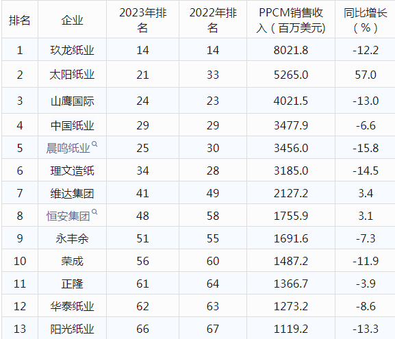 最新一期出版的美國paper360雜志根據(jù)2023年(部分企業(yè)為財年)企業(yè)紙漿、紙張、加工和貿(mào)易 (PPCM) 業(yè)務(wù)的凈銷售額為依據(jù),公布了最新的全球紙業(yè)75強名單。