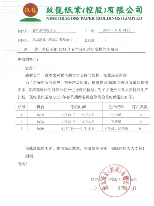 漲價風潮再掀波瀾,2025年首波漲價通知花落文化紙行業,是否與您的預期不謀而合?此外,玖龍紙業太倉和重慶基地春節停機計劃公布,預計減產14萬噸包裝紙。 玖龍紙業太倉和重慶基地春節停機計劃公布 隨著春節假期臨近,玖龍紙業多個基地陸續發布了2025年春節檢修計劃。除了東莞基地1月底至2月中旬將減產17.5萬噸(拓展閱讀:東莞玖龍2025年春節停機時間公布),太倉和重慶基地的大多數紙機也將在同期開展檢修,預計包裝紙市場供應合計削減約14.3萬噸。