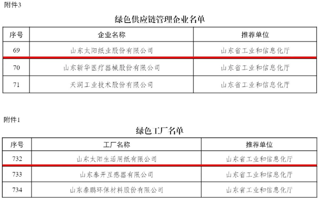 1月23日,工業和信息化部公布2024年度綠色制造名單,其中,山東太陽紙業股份有限公司榮獲“國家級綠色供應鏈管理企業”稱號,山東太陽生活用紙有限公司榮獲“國家級綠色工廠”稱號,這是繼公司獲評國家級綠色工廠、集團公司旗下產品榮獲國家級綠色設計產品后,企業在綠色低碳發展領域斬獲的兩項重量級榮譽。 綠色工廠是指實現用地集約化、原料無害化、生產潔凈化、廢物資源化、能源低碳化的企業,是綠色制造的核心實施單元。綠色供應鏈管理企業是指將綠色低碳發展理念貫穿于企業產品設計、原材料采購、生產、運輸、儲存、銷售、使用和報廢處理等全過程,實現供應鏈全鏈條綠色化水平協同提升的主導企業,是帶動供應鏈上下游工廠實施綠色制造的關鍵。