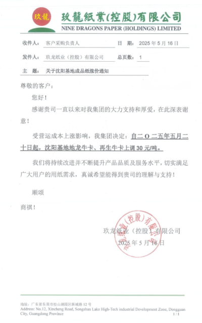 近兩日,玖龍沈陽、重慶、太倉三大基地相繼發(fā)布漲價(jià)函,宣布將對(duì)旗下部分紙種價(jià)格進(jìn)行上調(diào),此次調(diào)價(jià)將于5月下旬正式生效。
