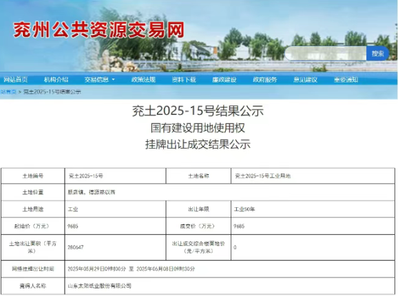 據(jù)金融界的報道:近日山東太陽紙業(yè)股份有限公司新增購地信息,項目位置于山東省濟寧市兗州市顏店鎮(zhèn),德源路以西,土地用途為二類工業(yè)用地。報道稱,該土地系年產60萬噸漂白化學漿及堿回收等配套工程項目,供地方式為掛牌出讓,面積為280647平方米,成交價格9685.0萬元,合同簽訂日期2025年6月16日。