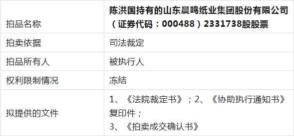 拍賣對象:陳洪國持有的山東晨鳴紙業集團股份有限公司(證券代碼:000488)2331738股股票