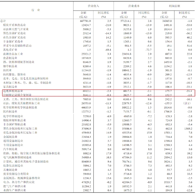 在營業收入方面,規模以上工業企業實現營業收入66.78萬億元,同比增長2.5%。其中,造紙和紙制品業實現營業收入6812.1億元,同比下降2.3%;印刷和記錄媒介復制業實現營業收入3141.1億元,同比下降0.3%。