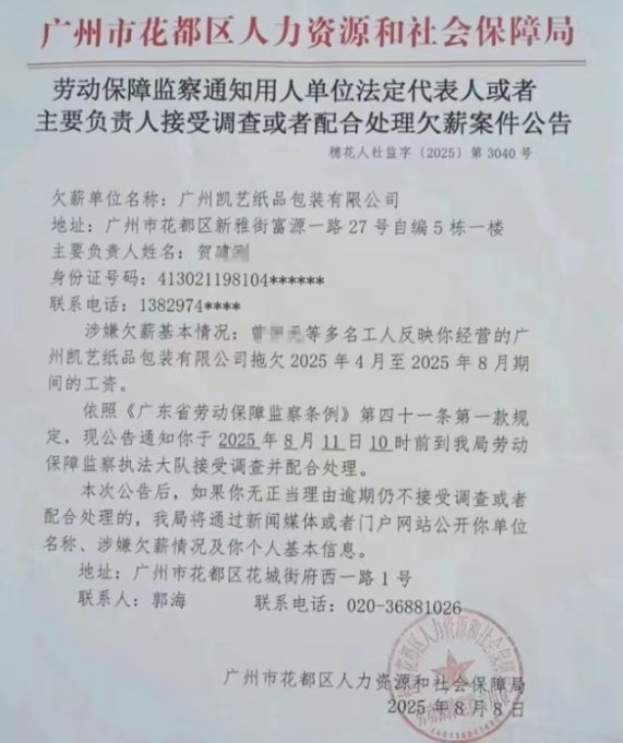 然而,面對成本不斷攀升、業務持續下滑等多重壓力,廣州凱藝紙品的資金問題逐漸浮出水面。在廣州市花都區人力資源和社會保障局于8月8日發布的一份公告顯示,該公司因拖欠2025年4月至2025年8月期間的工資,被要求接受調查并配合處理。