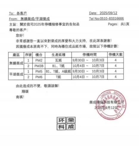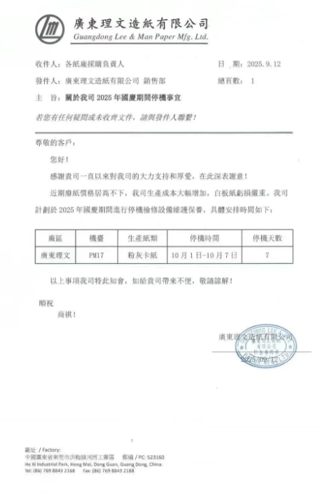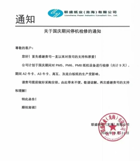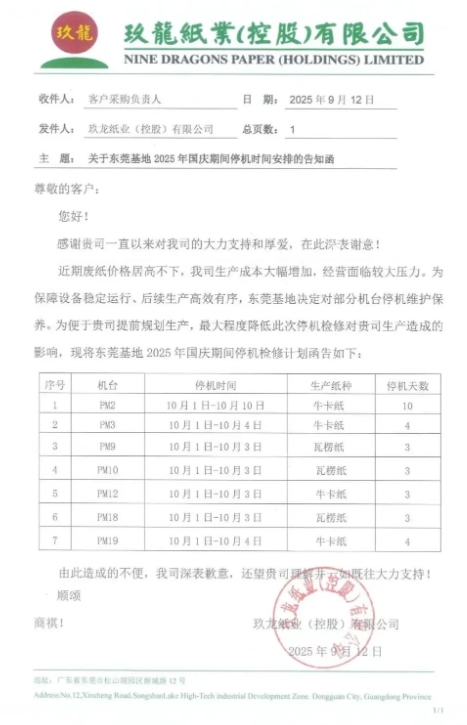•淄博永豐環保科技有限公司 自2025年9月13日起,瓦楞紙、環保紙、牛卡紙價格在原有價格基礎上上調30元。 •山東仁豐特種材料股份有限公司 自2025年9月13日開始,瓦楞紙在原有價格基礎上上調30元/噸。 •玖龍紙業東莞基地 自九月十八日起,東莞基地地龍再生牛卡、江龍再生牛卡、玖龍瓦楞紙、地龍瓦楞紙上調RMB/HKD30元/噸(USD4元/噸)。 •浙江金龍再生資源科技股份有限公司、浙江金勵環保紙業有限公司 在目前的銷售價格基礎上,從2025年9月15日起,我公司生產的再生牛卡/高強瓦楞紙銷售價格上調30元/噸。 •上海珀菲特包裝科技有限公司 從2025年9月11日17:00時起,所有紙板訂單在原價格的基礎上上調3%。 •上海瑞邦紙品包裝有限公司 自2025年09月12日08:00起,所有紙板訂單價格在原有基礎上上調3%(包括多層紙板,二層紙板)。 •上海勇玖包裝材料有限公司 從2025年9月11日16:00時對所有客戶所下訂單價格上漲3%。 •山鷹紙業 自2025年9月13日起,在原有價格基礎上: 廣東基地:T紙、瓦紙上調30元/噸; 自2025年9月15日起,在原有價格基礎上: 福建基地:紅杉系、瓦紙系上調50元/噸; •五洲特紙 從2025年9月18日起,針對集團旗下包裝紙系列產品在現有價格基礎上,上調30元/噸。 •金田紙業(東莞) 自2025年09月15日起,對東莞市金田紙業有限公司所產的金泊牌再生牛卡紙、金泊牌高強瓦楞紙在原價格基礎上統一上漲30元/噸。 •金田紙業(四川) 自2025年9月16日起,對四川金田紙業有限公司所產的所有高強瓦楞紙在原價格基礎上統一上漲30元/噸。 •玖龍紙業太倉基地 自九月十八日起,瓦紙/Y紙/B紙/E紙/T紙在目前價格的基礎上上調RMB30元/噸。 造紙廠國慶停機計劃 •東莞金洲紙業有限公司