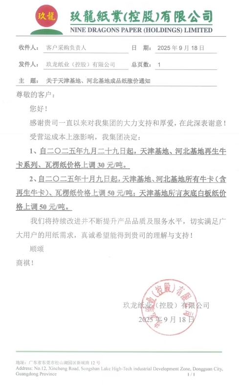 • 玖龍?zhí)旖颉⒑颖被?/strong> 1、自九月二十九日起,天津基地、河北基地再生牛卡系列、瓦楞紙價格上調(diào) 30 元/噸。 2、自十月九日起,天津基地、河北基地所有牛卡(含再生牛卡)、瓦楞紙價格上調(diào) 50 元/噸;天津基地所有灰底白板紙價格上調(diào) 50 元/噸。