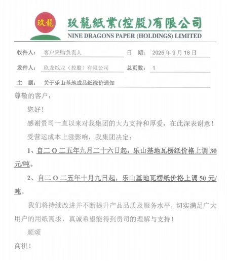 • 玖龍樂山基地 1、自九月二十六日起,樂山基地瓦楞紙價格上調(diào) 30 元/噸。 2、自十月九日起,樂山基地瓦楞紙價格上調(diào) 50 元/噸。