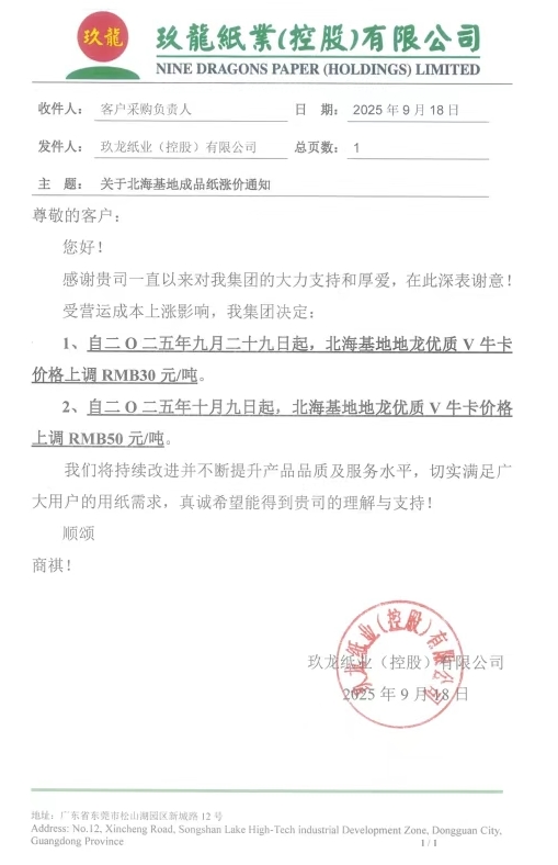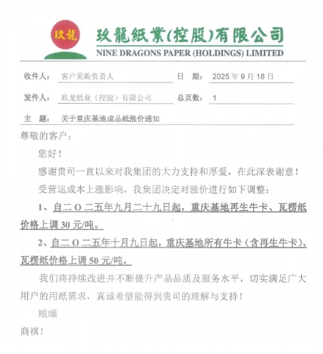 • 玖龍沈陽基地 1、自九月二十九日起,沈陽基地再生牛卡、瓦楞紙價格上調(diào) 30 元/噸。 2、自十月九日起,沈陽基地所有牛卡(含再生牛卡)、瓦楞紙價格上調(diào) 50 元/噸。  • 玖龍北海基地 1、自九月二十九日起,北海基地地龍優(yōu)質(zhì)V牛卡價格上調(diào)RMB 30 元/噸。 2、自十月九日起,北海基地地龍優(yōu)質(zhì)V牛卡價格上調(diào)RMB 50 元/噸。