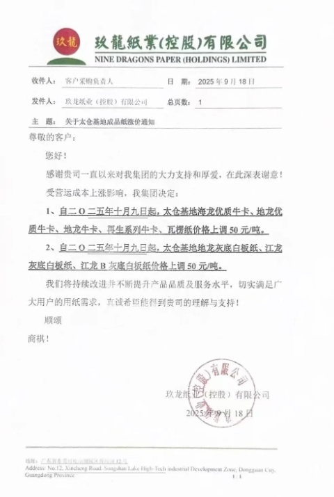 • 玖龍?zhí)珎}基地 1、自十月九日起,太倉基地海龍優(yōu)質(zhì)牛卡、地龍優(yōu)質(zhì)牛卡、地龍牛卡、再生系列牛卡、瓦楞紙價格上調(diào) 50 元/噸。 2、自十月九日起,太倉基地地龍灰底白板紙、江龍灰底白板紙、江龍B灰底白板紙價格上調(diào) 50 元/噸。