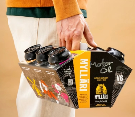 奧露畝 (Olutmylly) 是一家位于芬蘭福爾薩(Forssa)的家族釀酒廠。自2020年品牌重塑以來(lái),企業(yè)敏銳地意識(shí)到,在競(jìng)爭(zhēng)激烈的市場(chǎng)中脫穎而出不僅需要優(yōu)質(zhì)產(chǎn)品,更要在貨架上“吸睛”。幸運(yùn)的是,奧露畝與芬林紙板的創(chuàng)意包裝設(shè)計(jì)團(tuán)隊(duì)展開(kāi)合作,最終呈現(xiàn)出令人驚艷的成果。 奧露畝總經(jīng)理安妮·西爾馬拉(Anne Silmälä)笑著說(shuō): 我們的新品啤酒品鑒包裝絕對(duì)是最酷的六瓶裝!這款包裝不僅展示了我們精選的六款啤酒,更將品牌形象提升到了一個(gè)新高度。它在視覺(jué)和功能上都非常出色,我第一次看到設(shè)計(jì)方案時(shí)就被震撼到了。這個(gè)創(chuàng)意非常獨(dú)特,而最終呈現(xiàn)的效果也完全符合我們最初設(shè)定的高標(biāo)準(zhǔn)。 釀酒師米科·西爾馬拉(Mikko Silmälä)也表示: 這次合作是一次徹底的成功。罐裝啤酒被包裝得像引擎活塞一樣,啤酒的選擇也非常精致。 芬林紙板包裝平面設(shè)計(jì)師馬爾科·萊維斯卡(Marko Leiviskä)則稱這次合作是“天作之合”。他回憶道: 從2024年12月提出初步構(gòu)想開(kāi)始,我們的進(jìn)展非常迅速。小型企業(yè)在包裝解決方案方面更具靈活性,也更愿意在設(shè)計(jì)上大膽突破,這次合作正是如此。 引擎造型,點(diǎn)燃激情! 萊維斯卡的設(shè)計(jì)靈感源自汽車引擎——一個(gè)V型結(jié)構(gòu),正好容納六瓶啤酒。他說(shuō):“我覺(jué)得這個(gè)設(shè)計(jì)會(huì)深受那些喜歡改裝汽車、偶爾小酌的人群歡迎。后來(lái)我發(fā)現(xiàn)奧露畝的客戶中就有不少來(lái)自賽車圈,這一切仿佛都是命中注定。我們成功打造了一款專屬特定人群的產(chǎn)品。”
