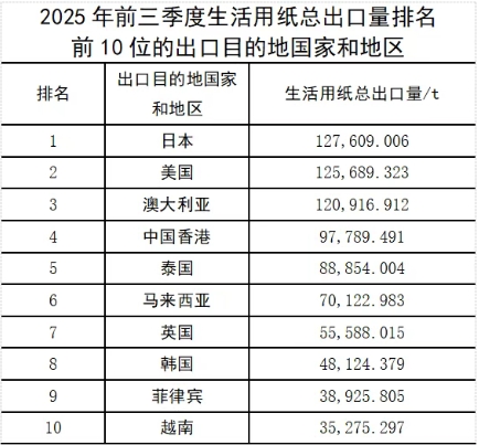 進口 2025年前三季度,生活用紙總進口量比2024年同期增長,但進口量很少,僅有約3.57萬t。進口的生活用紙以原紙為主,占總進口量的91.2%。 吸收性衛生用品 2025年前三季度,中國吸收性衛生用品出口量持續增長,進口量則不斷下滑,這主要是由于國內吸收性衛生用品產能增長、品質提升,對進口產品的需求下降。 出口 2025年前三季度,吸收性衛生用品的總出口量達128.42萬t,同比增長13.39%,嬰兒紙尿褲在吸收性衛生用品出口量中占比最大,占總出口量的43.44%。吸收性衛生用品的出口金額達33.10億美元,同比增長8.44%。 女性衛生用品、嬰兒紙尿褲、成人失禁用品的出口量均有不同程度的增長,但寵物墊、護理墊等衛生用品出口對應的商品編碼48189000(紙漿、紙等制的其他家庭、衛生或醫院用品)下的產品出口量同比下降7.59%。分析原因是美國加征關稅對我國二、三季度出口帶來一定的影響,該編碼下產品出口目的地排名第一的美國的出口量由2024年前三季度的93.095.289t,下降到2025年前三季度的73.015.091t。