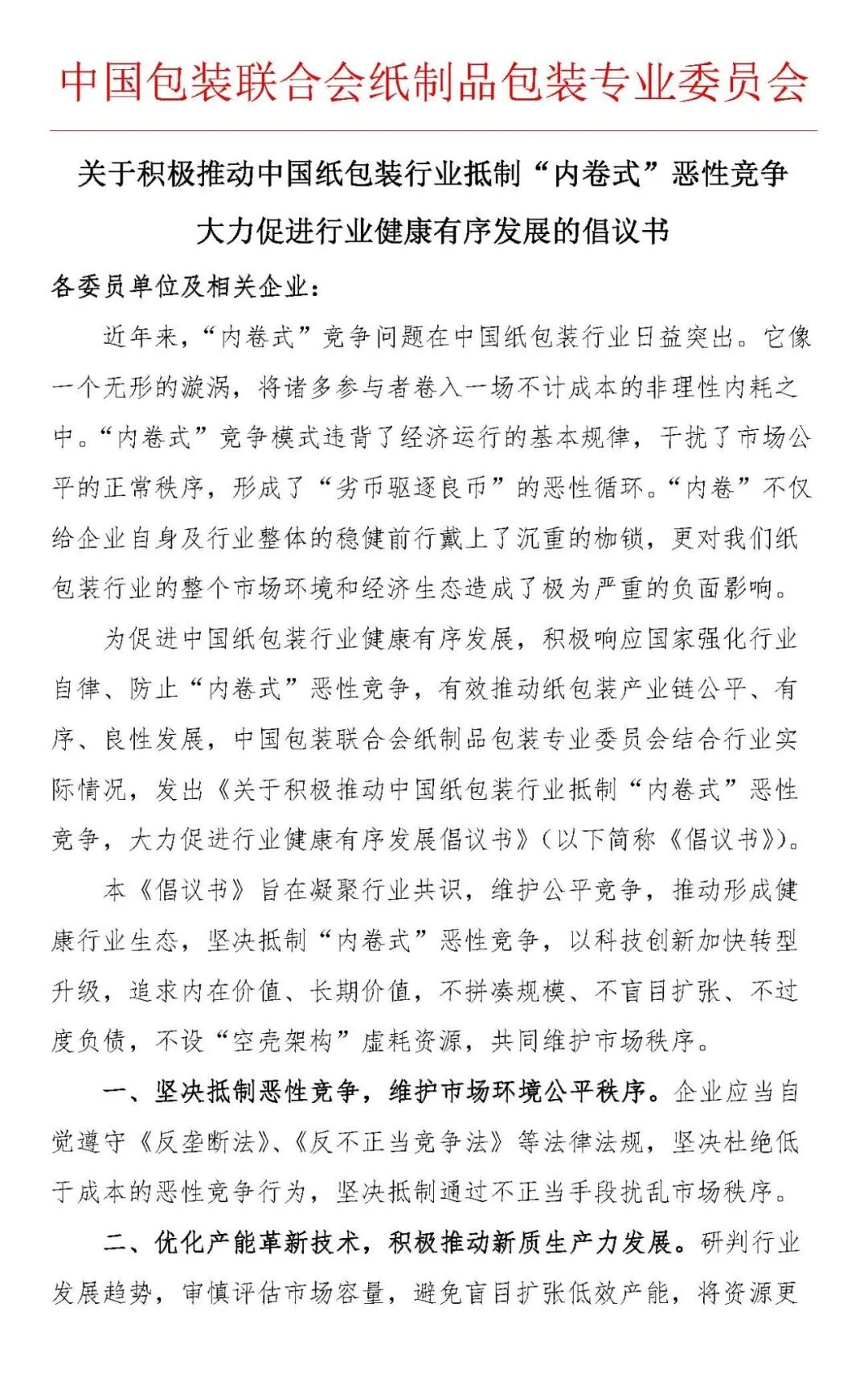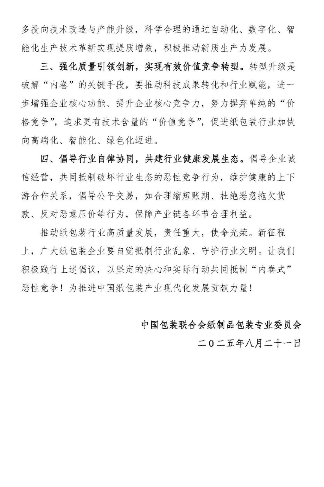 10月31日,“2025中國包裝聯(lián)合會紙制品包裝專業(yè)委員會年度委員大會”在佛山隆重舉行。會上,中國包裝聯(lián)合會紙制品包裝專業(yè)委員會張耀權常務副主任兼秘書長宣讀了《關于中國紙包裝行業(yè)抵制“內(nèi)卷式”惡性競爭,促進行業(yè)健康有序發(fā)展的倡議書》——呼吁全行業(yè)采取行動,遏制“內(nèi)卷式”競爭,推動行業(yè)走向更加健康、可持續(xù)的發(fā)展軌道。