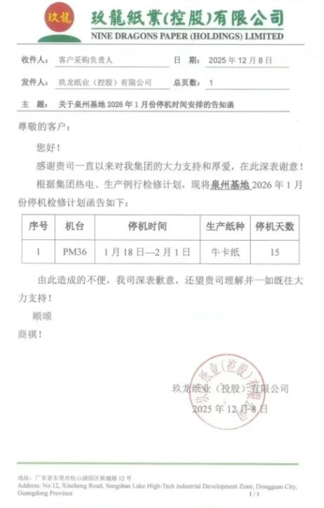 玖龍紙業(yè)泉州基地的PM36將從1月18日停機(jī)至2月1日,預(yù)計(jì)減產(chǎn)箱板紙1.3萬(wàn)噸。此外,玖龍北海基地的PM48將在1月底減產(chǎn)約2.6萬(wàn)噸箱板紙。
