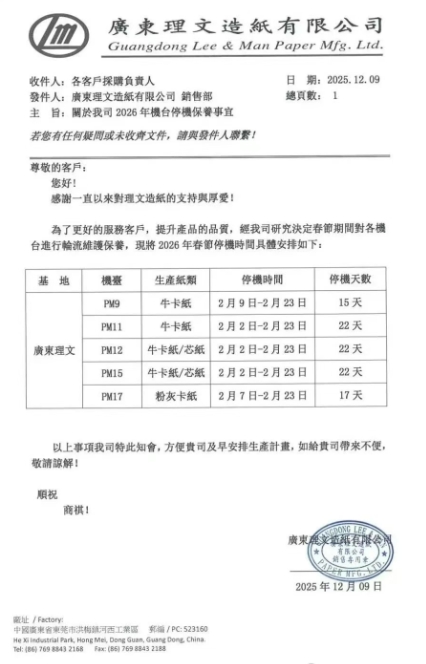 三家龍頭紙企宣布停機(jī)計(jì)劃,預(yù)計(jì)2026年初減產(chǎn)約27萬(wàn)噸包裝紙