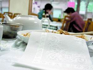 | 隨著人們生活水平的提高,生活用紙的產(chǎn)量不斷加大,一次性紙巾取代了傳統(tǒng)的手絹。出入餐廳、飯館用餐,人們難免要用餐巾紙,然而很少有人關(guān)心過它的質(zhì)量問題。一些地下小廠批發(fā)大卷的劣質(zhì)衛(wèi)生紙,切割后軋上花樣,就成了“餐巾紙”;甚至用過的衛(wèi)生紙經(jīng)漂洗加工后,也成了潔白的“餐巾紙”。