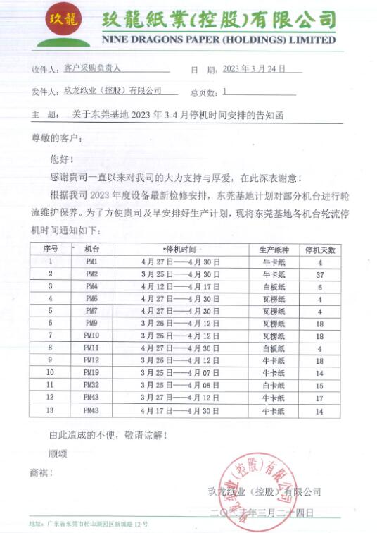 3月24日,玖龍紙業發布關于東莞基地2023年3-4月停機時間安排的告知函。