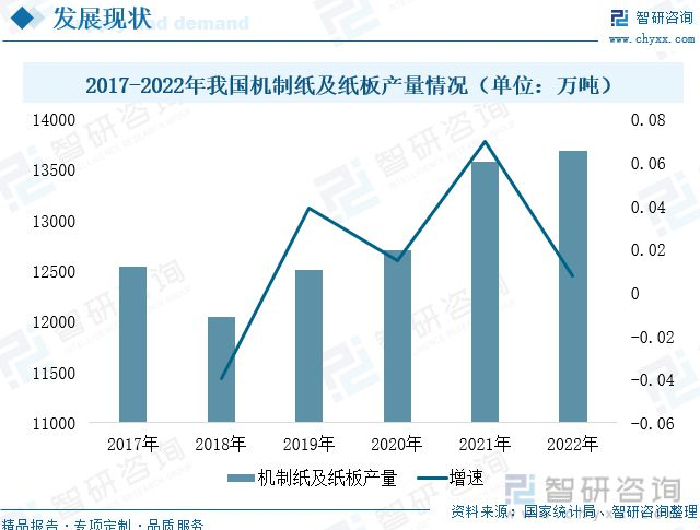 三、下游市場穩(wěn)健發(fā)展,行業(yè)需求潛力巨大 下游市場對造紙設(shè)備行業(yè)發(fā)展具有重要促進作用,下游產(chǎn)業(yè)不斷擴張有利于本行業(yè)市場開拓與產(chǎn)品研發(fā)。其中,紙漿是造紙工業(yè)中最重要的原材料,紙漿生產(chǎn)設(shè)備品類較多,主要包括磨漿機、分切復(fù)卷機、干燥漿板機、壓縮機等多個造紙設(shè)備。2017-2022年,我國紙漿產(chǎn)量及消費量不斷增加。2021年我國紙漿產(chǎn)量及消費總量分別增長10.83%和7.94%。2022年隨著下游用紙需求不斷增加,紙漿產(chǎn)量及消費量延續(xù)增速,同比增速約為15%和10.85%。未來,隨著國內(nèi)制漿生產(chǎn)線規(guī)模不斷擴大及對制漿質(zhì)量要求不斷提高,紙漿制造設(shè)備需求將進一步上漲。