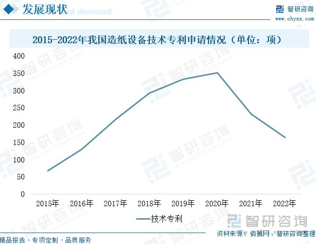 造紙設(shè)備是專業(yè)性很強的行業(yè),涉及機械、化工、材料、防腐等多個技術(shù)性領(lǐng)域。我國造紙設(shè)備行業(yè)發(fā)展歷程較短,行業(yè)整體技術(shù)水平相對滯后,市場規(guī)模較小。從國際市場看,造紙設(shè)備生產(chǎn)商主要集中在德國、美國、意大利、日本等制造業(yè)發(fā)達地區(qū),與國際造紙設(shè)備領(lǐng)先企業(yè)相比,國內(nèi)造紙設(shè)備供應(yīng)商在規(guī)模、技術(shù)以及質(zhì)量方面,都存在較大差距,長期以來大型造紙機械設(shè)備均依賴進口。近年來,國家出臺了多項推動造紙行業(yè)技術(shù)及設(shè)備創(chuàng)新發(fā)展及綠色轉(zhuǎn)型政策。其中,為了提高我國造紙機技術(shù)水平,加快大中型造紙機國產(chǎn)化進程,國家還安排了國債支持的技術(shù)改造資金,以引進部分技術(shù)項目。在“制造強國”戰(zhàn)略及相關(guān)政策引導(dǎo)下,造紙設(shè)備行業(yè)參與者逐漸增多。隨著造紙設(shè)備生產(chǎn)商紛紛加大研發(fā)力度及航空、造船等跨行業(yè)投資者參與布局造紙機械設(shè)備的研發(fā)生產(chǎn),行業(yè)技術(shù)水平逐步提高。截至2022年底,我國合計擁有2273想造紙設(shè)備相關(guān)專利,其中實用新型專利1670項,發(fā)明專利578項。其中,2022年新增造紙設(shè)備專利164項。并研發(fā)創(chuàng)新了廢紙制漿成套技術(shù)裝備、鼓式碎漿機、新型封閉篩選設(shè)備、雙盤磨漿機、超級壓光機等多種設(shè)備,設(shè)備國產(chǎn)化進程不斷加快。2022年我國新增造紙設(shè)備技術(shù)專利164項,較前兩年略有下滑,但與2016年之前相比仍處于較高水平,行業(yè)研究開發(fā)加快。近幾年,隨著造紙設(shè)備水平不斷提高,我國市場份額也在逐漸提升。預(yù)計,2022年我國造紙設(shè)備市場份額占全球總份額將提升至28%左右,行業(yè)國產(chǎn)化進程也將進一步加快。