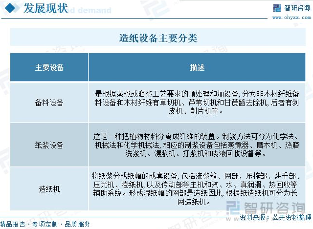 相關(guān)報告:智研咨詢發(fā)布的《2023-2029年中國造紙設(shè)備行業(yè)運營現(xiàn)狀及市場分析預(yù)測報告》 二、行業(yè)自主創(chuàng)新能力不斷加強,設(shè)備國產(chǎn)化進程加快 造紙產(chǎn)業(yè)是與國民經(jīng)濟和社會事業(yè)發(fā)展關(guān)系密切的重要基礎(chǔ)原材料產(chǎn)業(yè),紙及紙板的消費水平是衡量一個國家現(xiàn)代化水平和文明程度的標(biāo)志。造紙設(shè)備作為造紙產(chǎn)業(yè)中游領(lǐng)域重要細分市場,其技術(shù)水平關(guān)乎到行業(yè)整體發(fā)展水平。 造紙設(shè)備主要包括粉碎設(shè)備、傳輸設(shè)備、濕漿機,擠水機、折疊機、破碎輸送機以及打包機等。根據(jù)紙漿造紙的工藝流程,造紙機械可以分為備料設(shè)備、紙漿設(shè)備、造紙機及整飾加工機械。其中,備料設(shè)備是在蒸煮或磨漿前,按蒸煮或磨漿工藝要求進行預(yù)處理和加工的設(shè)備,分為非木材纖維備料設(shè)備和木材纖維備料設(shè)備,包括切草機、切葦機、剝皮機、削片機等。制漿設(shè)備是將植物原料分離成纖維過程所用的設(shè)備,包括蒸煮器、磨木機、熱磨機、洗漿機、漂漿機、打漿機和廢液回收設(shè)備等。造紙機全套設(shè)備包括流漿箱、網(wǎng)部、壓榨部、烘干部、壓光機、卷紙機,以及傳動部等主機和水、真空、潤滑、熱回收等輔助系統(tǒng)。